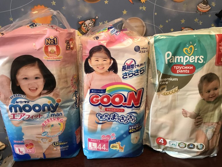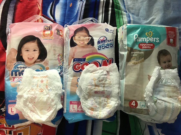 Сравнение подгузников-трусиков размер L Moony, Goon, Pampers premium