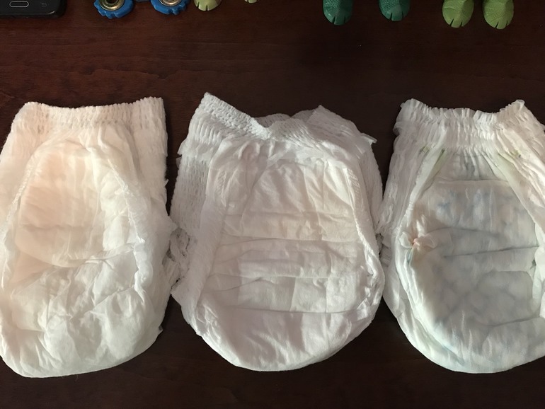 Все трусики тонкие, при наполнении гель мягкий, сильно не раздувается, а Pampers за счет каналов не сбивается в комок.