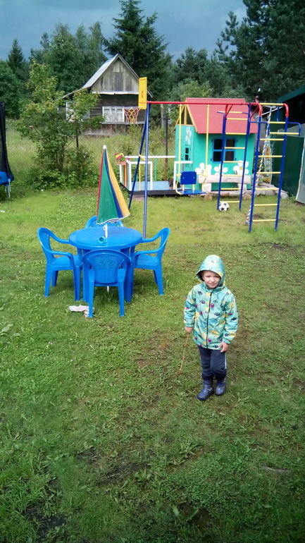 У нас батут, песочница, качели, бассейн надувной. Ещё участками скинулись, сделали общую детскую площадку со спортивным комплексом.