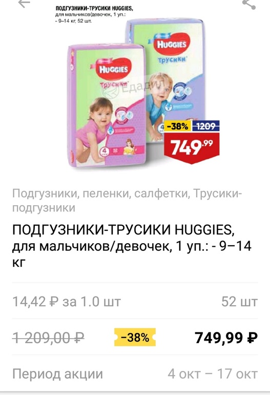 Спасибо! Как раз закончились подгузы и искала, где подешевле купить. В ДМ коробок нет в наличии по хорошей цене.