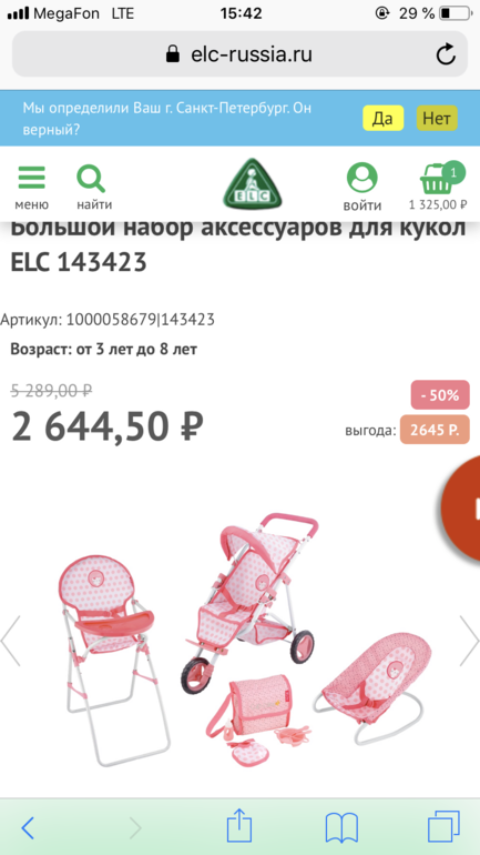 У нас похожий из Elc. Нам очень нравится. Цена нормальная. У нас сумка не держит форму так как нет жесткости просто сшита из материала. И стульчи4 немного другой. И шезлонг с ручками как переноска. Но колечка очень похожа и она самая любимая из-за неё весь набор и покупали.