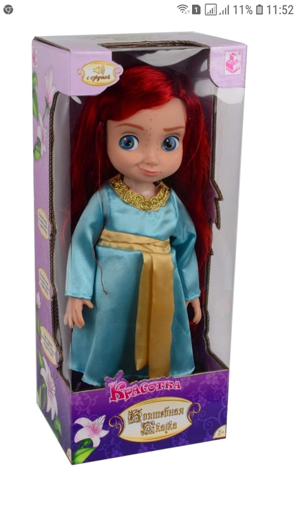 Я её буквально пару недель назад покупала в подарок племяшке (верхнюю). Выражение лица у неё просто сказка). Внешне она ну оооочень красивая. 2 минуса - платье простенькое и туфельки слетают (надо резинками прикрепить, если хотите в них ходить). Ну и песенку поёт классную, но к мультику никакого отношения не имеет).