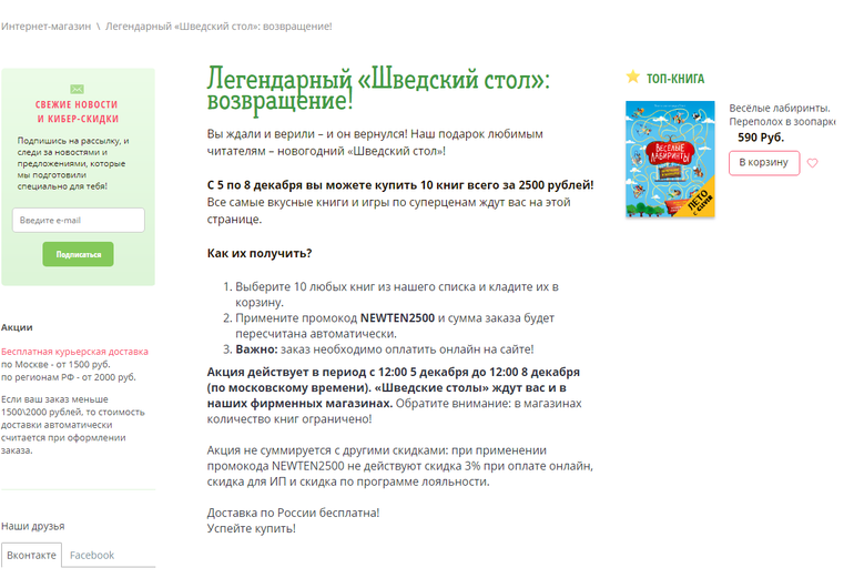Спасибо!оформила заказ.пока выбирала, одну книгу из корзины увели....выбор ограничен, но дешевле,чем в майшопе с 25% и это радует.