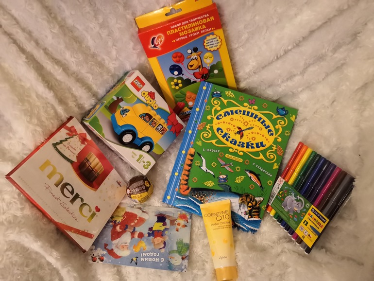 Нам все очень-очень понравилось, а муж поверить не мог, что посылка от совершенно неизвестного человека-ведь там мои любимые конфеты, крем для рук, который всегда мне нужен, Лего дупло, которое любит сын и аппликация из пластилина, от которой он тоже в восторге.