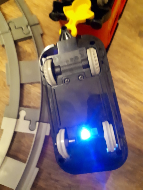 Едет вперед и назад от легкого движения, горят фары.В наборе пластинки проезжая по которым поезд останавливается, гудит, включает или отключает свет, заправляется и еще 1- движение в обратное направление).