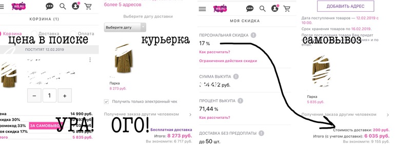 У меня сейчас так (процент выкупа: 88,35%) Самовывоз Курьерка И то и другое бесплатно, но при самовывозе скидка, в данном случае всего 161, но бывает и больше. Недавняя и малопонятная мне фишка. Хорошо что ПВЗ у меня через дорогу и работает до 21.00, т.к иногда принципиально нет желания отдавать эти копейки просто так.