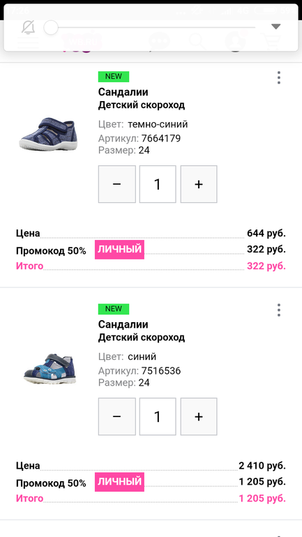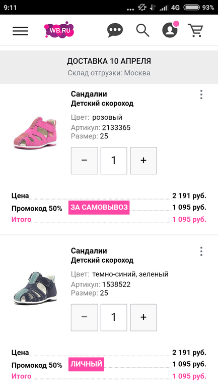 а что такое промокод 50% за самовывоз? у меня стоит -35% Сандали по 1324 руб. те, которые у Вас за тысячу.