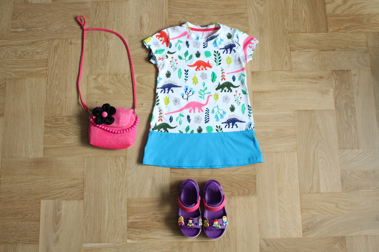 От динозавров мальчишечьих - к динозаврам девчачьим. Моя Маргарита давно уже сама строго согласовывает свой гардероб. Предлагала ей платья с лошадками, с сердечками... Нет, говорит, хочу вот это с динозаврами.