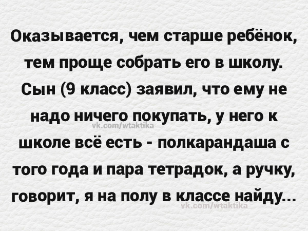 В точку! Собираю старшего на второй курс института)) один в один слова😂 кроме ручки с пола)) и то, потому что другие первыми подберут😆 поэтому на 1 сентября - только ручки👌🏻
