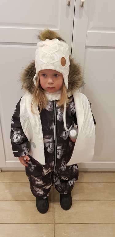 Детская одеждаДобрый день! Сегодня в Стокманне купила комбез за смешные деньги. Решила разбавить его светлыми аксами от Рейма. Так же были куплены сноубутсы Моло по скидке. Не мрачновато ли для девочки?! Рукава подвернуты резинками внутрь, великоваты.