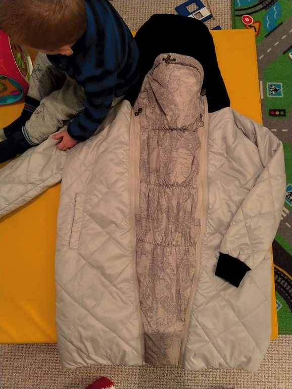 Сама слинговставка же от другой модели, поэтому оказалась слишком высоко. Висящую часть можно затянуть утяжкой. Правда, через боковые молнии теперь нет доступа к малышу, они тоже слишком высоко оказались. Мнение аудитории какое, я смогу до апреля проходить в таком виде? Или все же отрезать лишние 10-15 см снизу, перешить фермуары и сделать как положено?