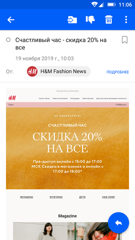 | *НЕ ПРОПУСТИТЕ! - СЧАСТЛИВЫЙ ЧАС СКИДКА 20% НА ВСЕ: Скидки в магазинах и онлайн с 17:00 до 18:00. Предложение действует на hm.com с 15:00 до 17:00 по московскому времени и в магазинах с 17:00 до 18:00 по местному времени 19/11/2018 или пока товар есть в наличии. Ассортимент и цены в магазинах и онлайн могут отличаться. Данное предложение не суммируется с другими акциями, предложениями и распродажей, а также не действует на специальные и лимитированные коллекции. |