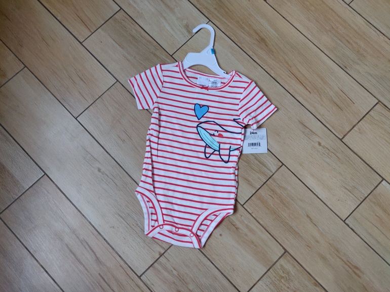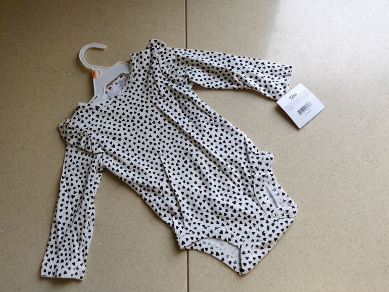 Бодик с сердечками. Тоже всего 245 р. К сожалению, оказался маловат. Это был самый большой оставшийся размер, а дочке-то давно не 12 месяцев... Просто в некоторых фирмах мы вполне влезаем в размер 80. Но, видимо, не в этой. Наверное, отдам в пристрой. Расцветка очень модная.