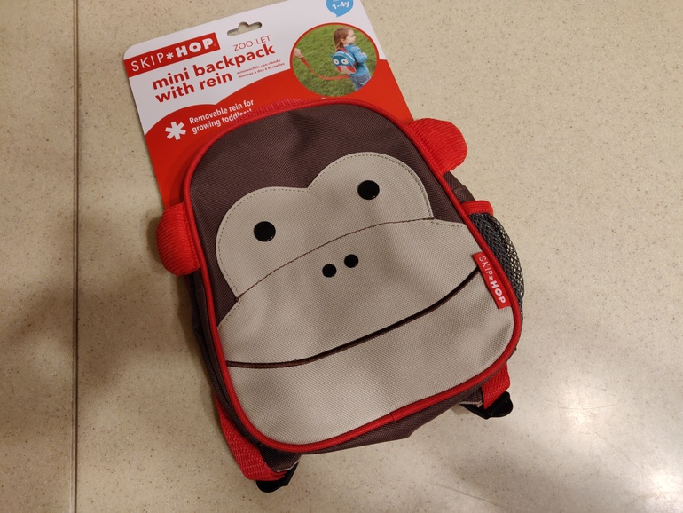 Еще взяла меленький рюкзачок. Он от года, но будем носить его наверное уже весной, с двух лет. Расцветка спорная для девочки, но я забрала последний, выбора особо не было. У нас есть красная курточка. Возхможно с ней будет хорошо смотреться. У этого рюкзачка есть поводок, но не уверена, что буду пользоваться такой штукой. Все-таки чисто психологически спорная для меня вещь 🙂
