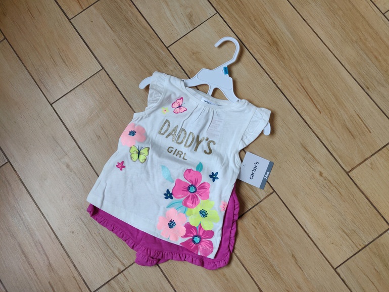 Футболка и шорты с надписью daddy's girl. Хоть этого добра у нас и навалом, но мимо надписей про папу я пройти не могу 😌