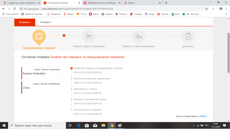 Неудачные покупкиПервый раз там заказала одна посылка пришла отлично, а вторая зависла((( подскажите пожалуйста что можно сделать в такой ситуации?