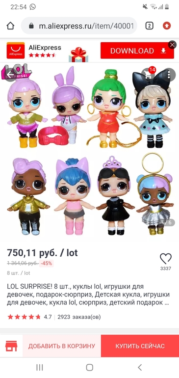 Ребенок доволен, мама тоже-это самое главное...единственное согласна с девочками в сад не носите, дети жестокие!!! Мы про лол тоже узнала из сада, страдала, купили понесла играть, т.к. все играли, а с с ней не делились...В 1 же день потерялась, нашлась в шкафу у др.девочки-больше в сад не просит... У нас есть и оригиналы и с али, но все со съемной одеждой, любит переодевать...Вам нужно было купить меньше, но по интересней...если интерес не пропадет, то по изучайте али-найдете интересные варианты