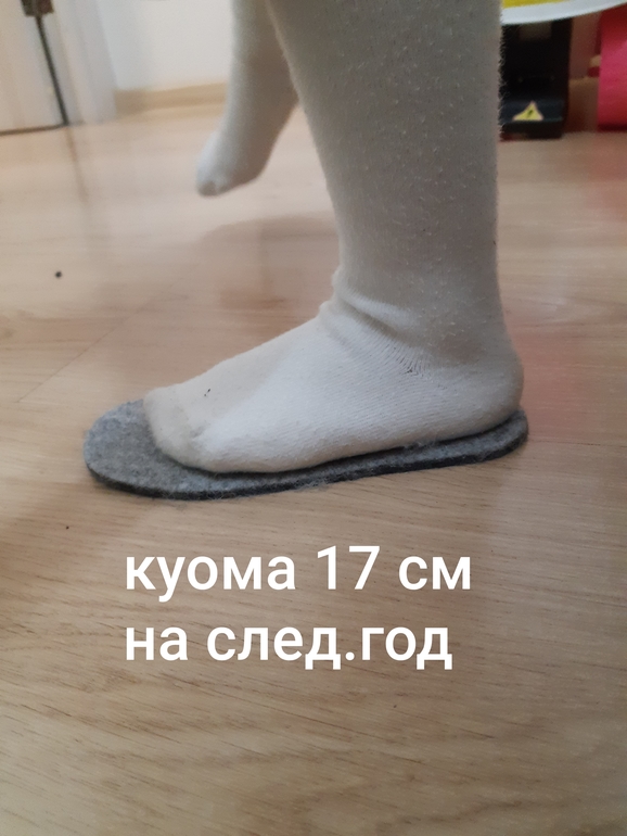 В том году носили в марте из последних сил куому, нога была ровно по стельке и ноги были холодные! В этом году с запасом 1 см носим на одни колготки и отлично, ноги теплые.