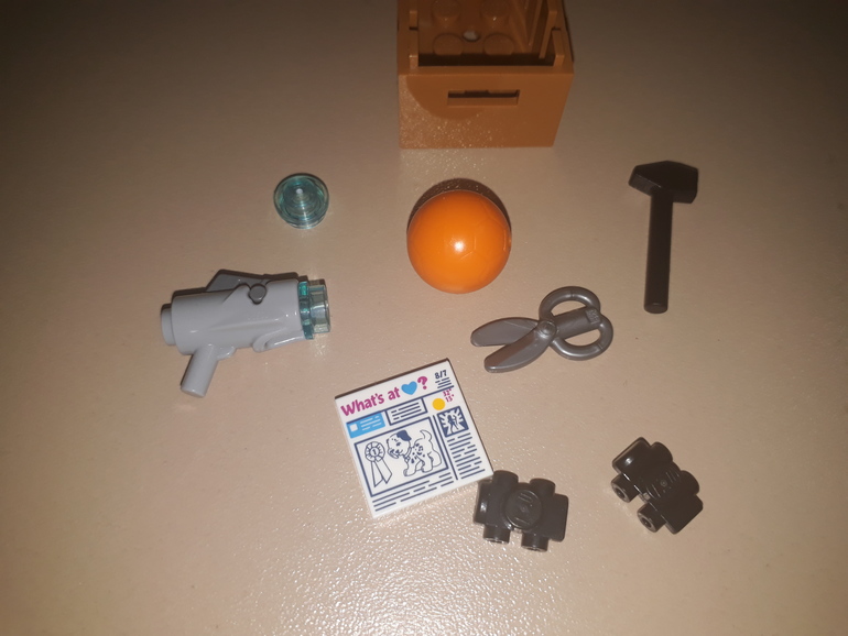 В ящике внизу дерева лежит мяч, водный пистолет(стреляет по настоящему),молоток,ножницы,ролики,газета