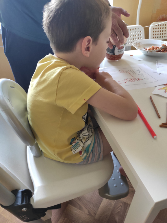 Сейчас в детской обычный стол, обычный стул, сидит по понятным причинам криво, добавлю фото ужаса через пару минут. На кухне у нас есть 2 растущих стула, старший уступил свой стул младшему полгода назад, сам сел на обычный. И с тех пор скривился. Сейчас на кухне стараюсь сажать на растущий, но тоже кривится на нем, видимо, уже привычка, постоянно поправляю, минут на 5 хватает и "уползает" снова.