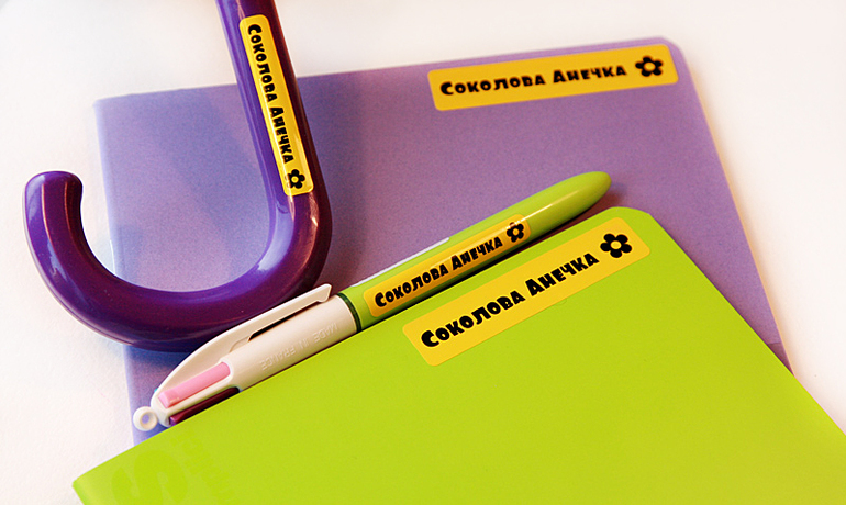 Ручки и карандаши сразу покупала с полем для подписи. Резинки прямо на них ручкой, на линейках маркером для дисков.