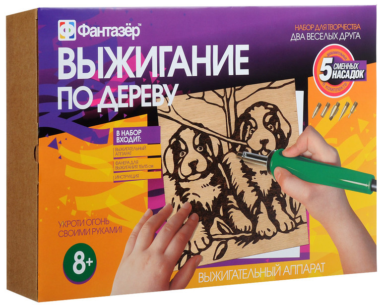 Я не вспомню фирму. В нашем было две выжигательные ручки, это удобно если выжигать разными насадками. Иртересно наличие сменных головок. От пошире поуже, до до фигурных штампиков.