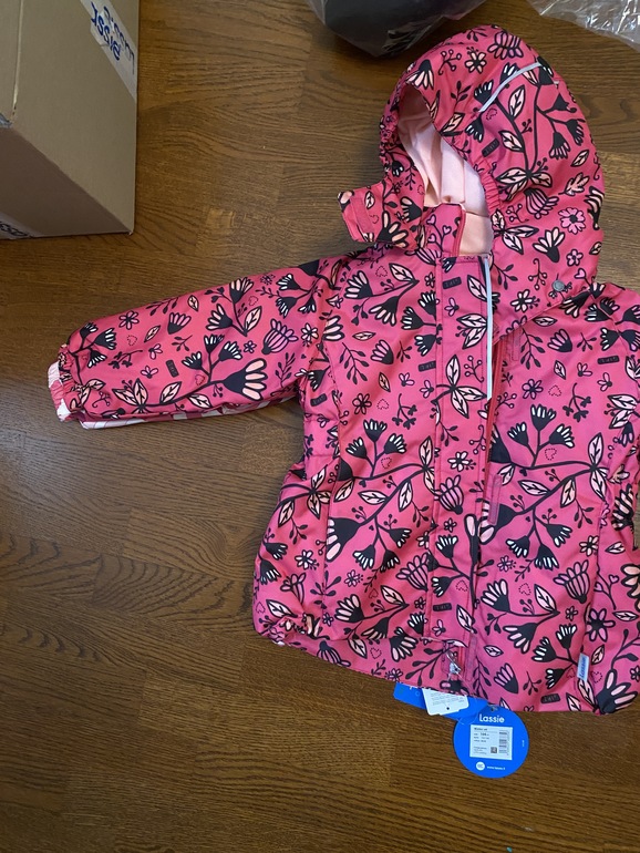 Сначала купила комплект на оф.сайте 104 размер, ожидая по привычке, что будет большой запас у Лесси. В итоге куртка такая же, как 98, которую сейчас носим.