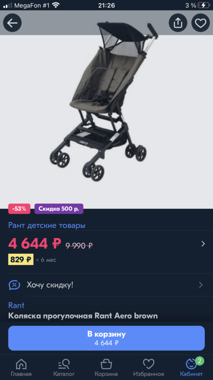 Интернет-магазины России и стран СНГКому нужна компактная прогулка? На озоне скидка. Цена 4644 + скидка при оформлении ещё 500 рублей. Складывается Мега компактно, пройдёт в ручную кладь самолета. Получу - напишу отзыв
