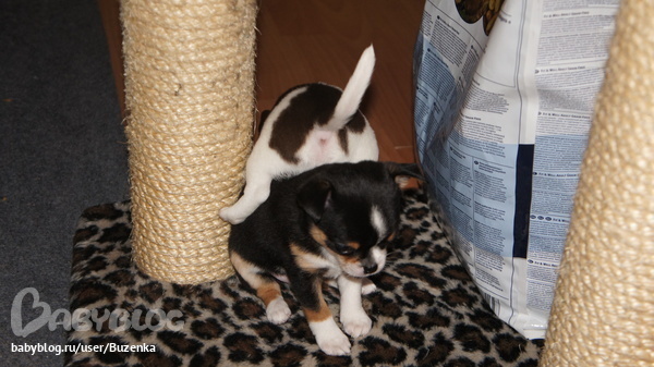 Через 4 дня нам 1,5!!!!!!!!месяца) уже совсем большие, носятся, кушают сушку, ходят на пеленку уже практически без промахов) Ну и пристают к маманьке, грызут ей соски, надо ей уже попону одевать