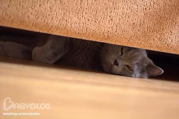 А кто у вас живет под диваном? У нас серый, большой и плюшевый Котик) Жарко ему, не знает куда спрятаться.