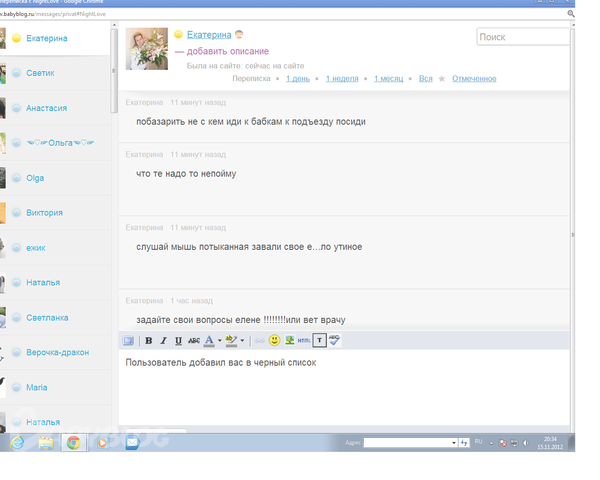 да, она облила меня дерьмом и добавила в ЧС:)))) Не удивлюсь, если после моего комментария получу еще письмецо от нее :)))).