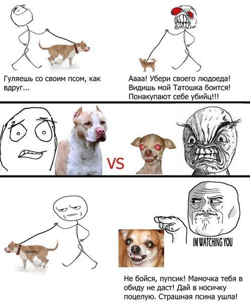 У меня месяц назад была такаю ситуация: гуляю я со своей Владой (кане корсо, 1.4 года, не агресивная, обученная -ОКД-1), и слышу лай какой-то маленькой собачки. поворачиваю голову, а на нас через всю поляну бежит чихуахуа и на крики хозяйки вообще не реагирует. я стараюсь Владу спрятать за себя и проделаваю такие "танцевальные па" только чтобы ее не укусили. и кричу хозяйке, чтобы она забрала свою собаку, потому что ее пытается укусить мою. Картину надо было видеть.... проходящий мужчина смеялся до слез.