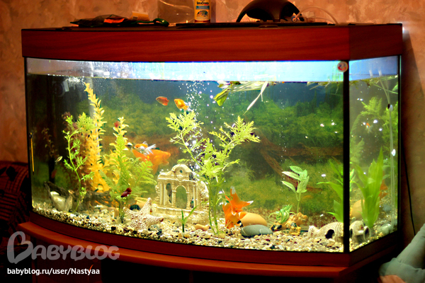 Помимо этого год стоит внешний фильтр и недавно поставили внутренний, т.к. население немаленькое. Водичку заливаем фильтрованную. Засыпаем туда средство для подготовки аквариумной воды (у нас он в виде порошка). Водичка не пахнет, прозрачная, рыбки ттт не жалуются)))