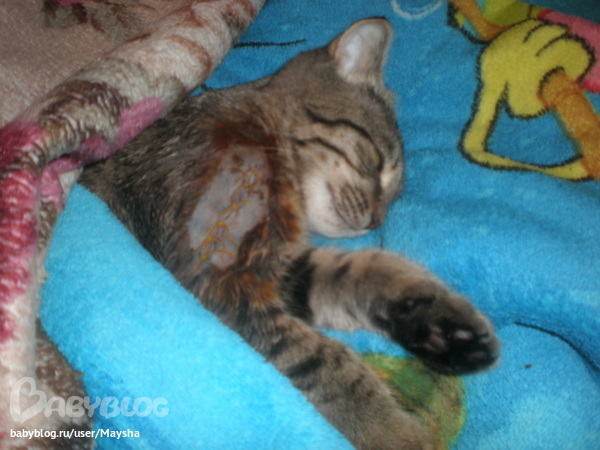 И вот вчера 21 в 18 нуль нуль мая девочка перенесла операцию(собрали косточьку при помощи штифта и наложили 6 швов) от наркоза отходила почти до утра да и сегодня еще не оклимается никак!!! Да и еще прописали укол внутримышечные и они ведать жуть больные теперь еще и задняя лапа подволачивается((( спит все время и не на секунду не отходит от меня!!! я на кухню смотрю ковыляет я на диван она опять ко мне)))