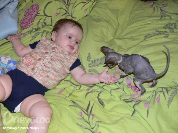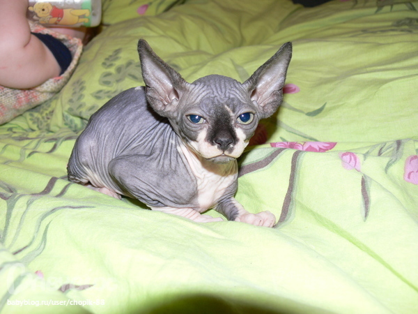 Очаровательный Донской Сфинкс по имени Добби! Вся семья в восторге! Особенно муж, ему давно такая порода нравилась! Когда нам его привезли, мы думали, что котенок будет всего бояться и прятаться (тем более у нас уже две кошки дома живут) Ничего подобного, и часа не прошло, а он уже по комнате носился! У нас с мужем на руках посидел, с детьми поиграл (дочку за руку ловил).