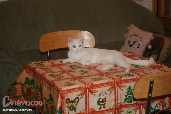 На столе это на новый год было. Она тут как скелет. Щас вон жирненькая стала. Это я за тарелками ушла а когда вернулась кошка решила быть главным блюдом вечера. У меня кот не так лазиет. А эта то на дверь наверх запрыгнет то вот на кухню стла лазить.