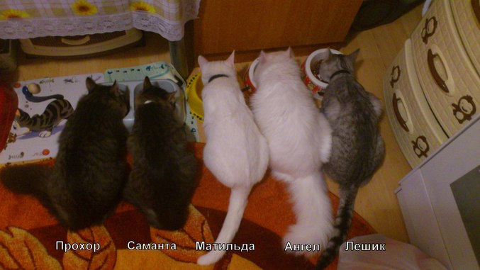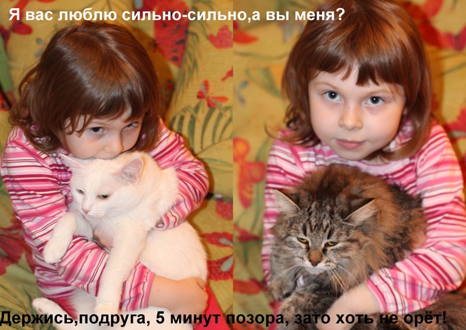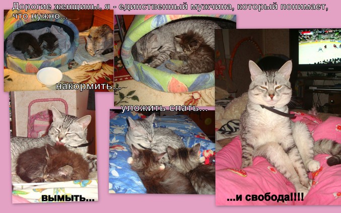 Здорово у вас! У меня вот три кошки дома... На третьего еле-еле уговорила мужа. А теперь и он и сам рад, что нас столько... А какая я счастливая... Я вас понимаю...