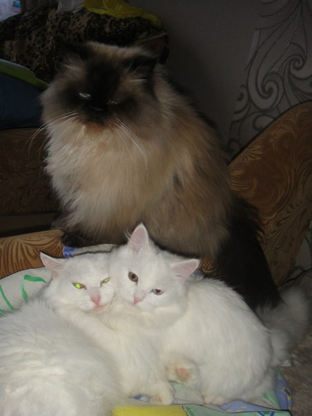 Его точно нет, а вот стареньких Макса с Муськой он гонял как молодых, они бедные не знали куда от него деться) Вот кстати они, Макс гималайский, Муська белая ангорка с одинаковыми глазами, а наш Тайсон белый с разными глазками.