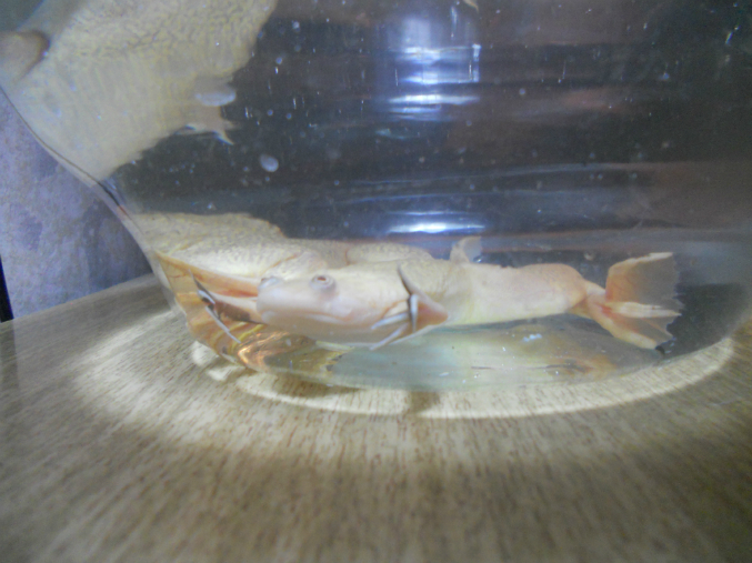 Сейчас почитала в нете,а их можно и в большом аквариуме держать.(Только я в большой их не посажу.Там мальки Гуппи-сожрут!)А они их держали с малым количеством воды и без комней-"голый" аквариум. Почитала,самка крупнее и есть "выступ" между ног,а Кума думала что самка меньше.Оказалось наоборот.