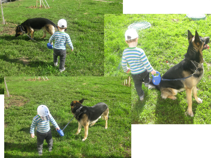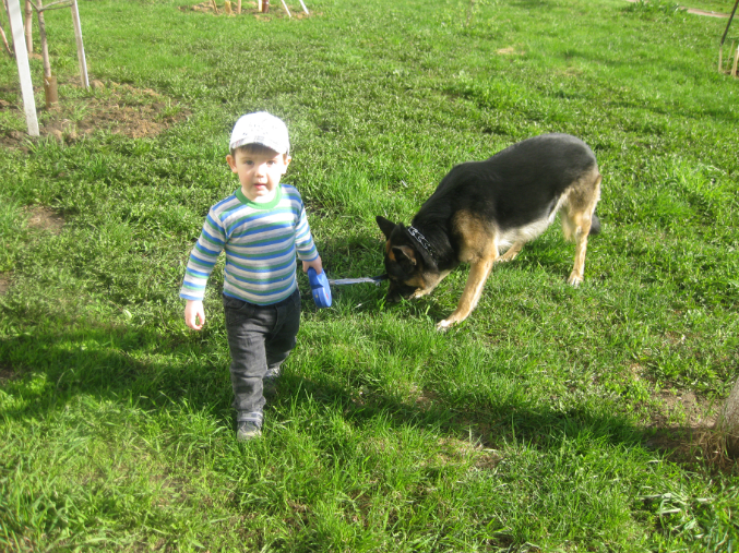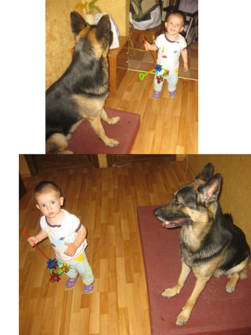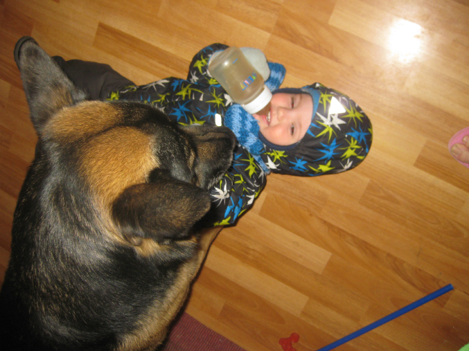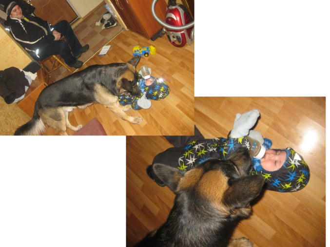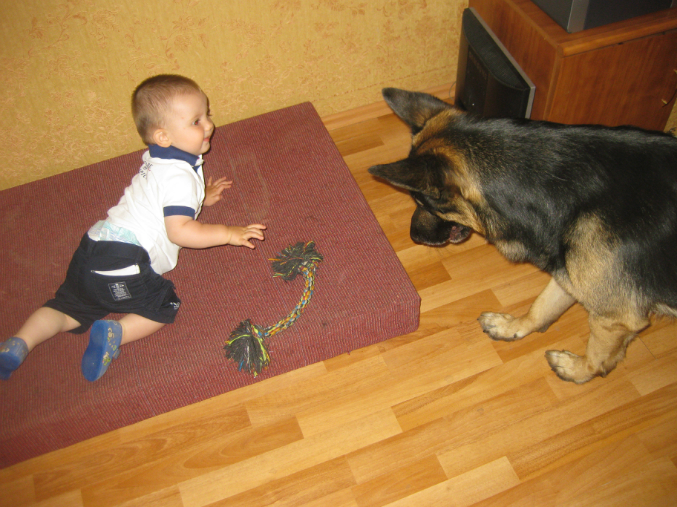 Когда Серенька родился Хардику было почти 2 года. Никогда не боялась, что они не поладят. Овчарки собаки умные и дружелюбные (с кем надо))). Месяцев до 4 Сережа нашу маленькую собачку не замечал, а потом как-то увидел как он игрушку ловит и первый раз в голос засмеялся несколько раз. Хардик иногда нюхал Сережкину пяточку или голову мог полизать, но особого интереса не проявлял. Зато теперь они у меня друганы - играют во всю)