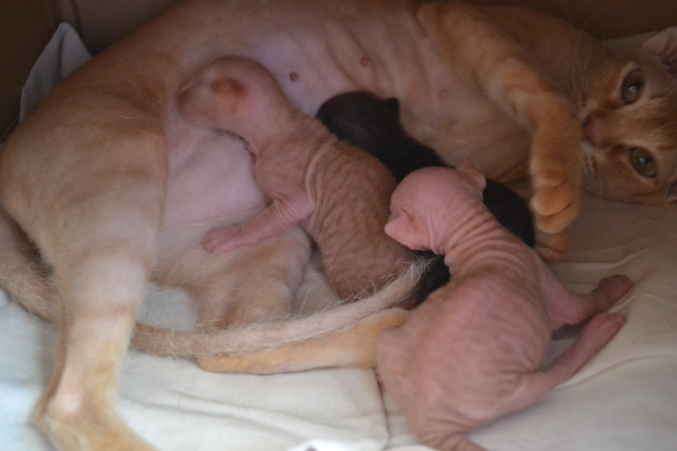 На 2, 3 - это они сегодня. Третьего котенка сфоткать не удалось пока - он очень пищит, а кошка его сразу тащит в гнездо))
