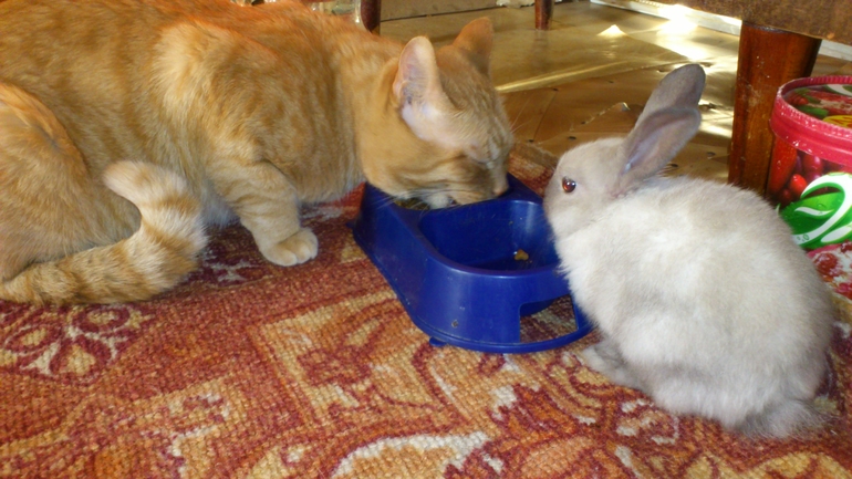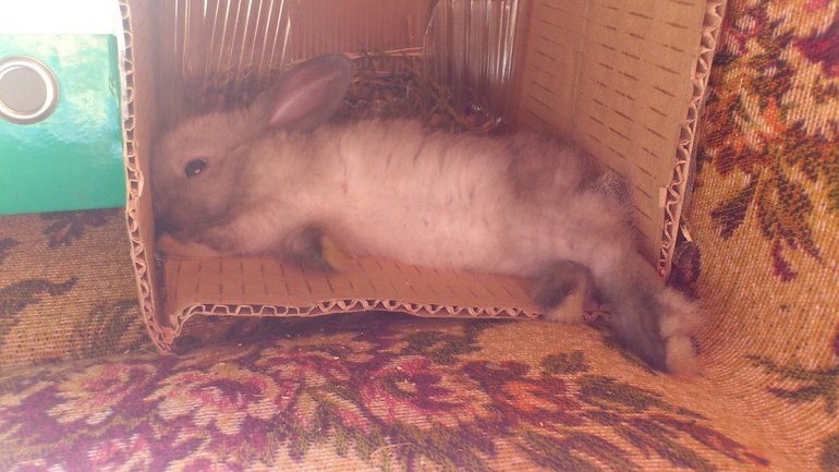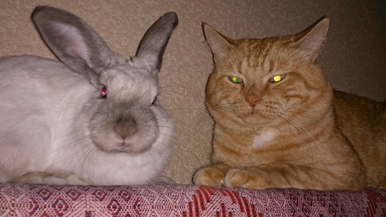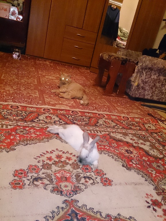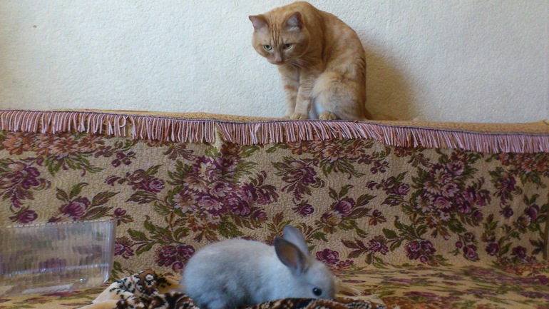 То, кого вы видите на фото - походило, скорее на мышонка, нежели на декоративного зайчика... Маленькое, серенькое, пугливое... Мой кот Кузьмич тут же заинтересовался необычным соседом - и сидел выжидал подходящего момента))