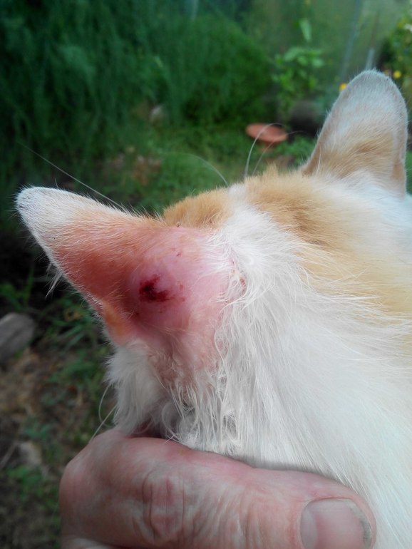 не очень видно, но под ухом все отекло у него.и через рану занес инфекцию.... очень страшно в реале. Чем можно помазать? сейчас обработала хлоргексидином намазала левомеколем и зеленкой. что еще? щас присматриваюсь к нему вроде мешает ему ухо. спит странно... короче сижу реву. Что еще есть противоваспалительного? уколы мы плохо переносим.....