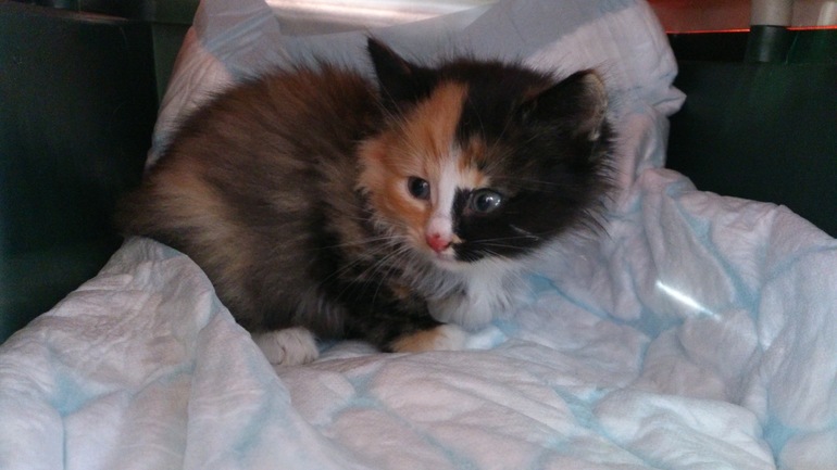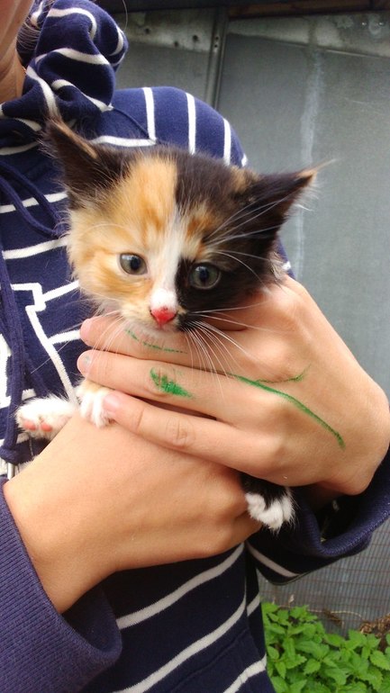 Трехцветная малышка, на вид около 2-х месяцев, кушает сама, очень игривая и прыгучая, с отличным аппетитом:) Я ее посмотрела, у нее даже блох нету, точно домашняя. На носу кожица ободрана, а так на вид здорова. По всем вопросам пишите в ЛС