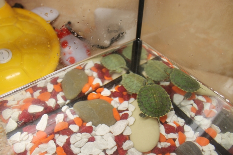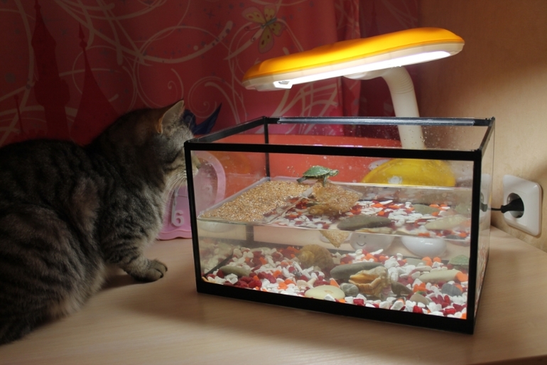 А кот не трогает? У меня жила на передержке черепаха так кот ее лапой достать пытался. А так уф лампу прикрепите а то панцири кривые будут да и рахит может начаться.