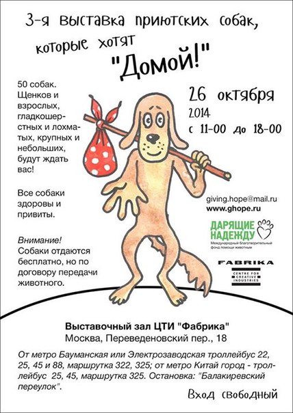 Я не из Москвы, но есть там и друзья. Больше на них рассчитываю чтоб информация дальше распространилась. Поскольку участие животных дорого обходится, можно же и просто фото других подопечных взять и показывать желающим. Главное заинтересовать людей, которые смогут позже приехать в сам приют. Жалко, что такие мероприятия проводятся платно((((.