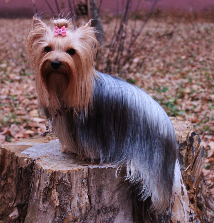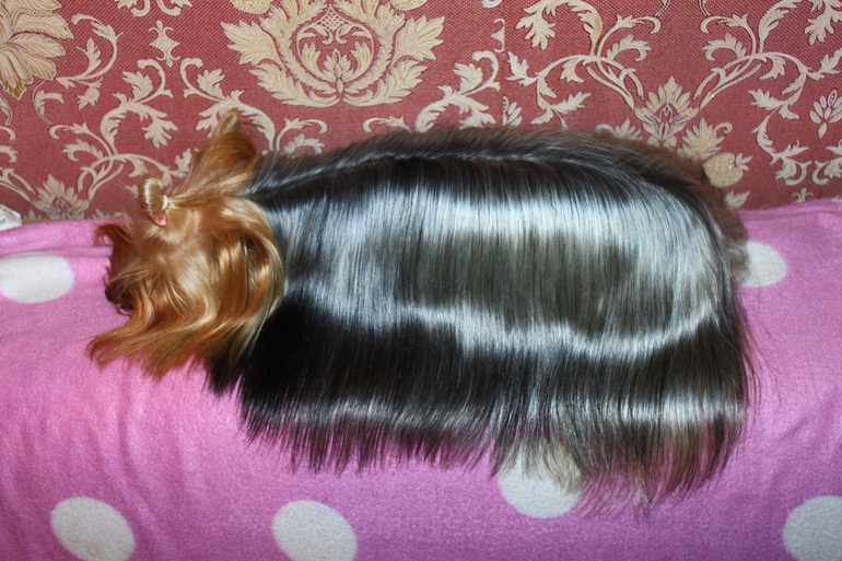 Какая красотка:)шерсть просто восторг:) у меня тоже девочка йорк и тоже с шерстью длинной,но терпение мое уже на исходе чесать ее,планирую весной подстричь)))