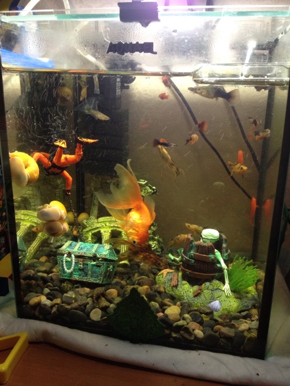 На одну золотую нужно от 50 л воды и не меньше! У вас еще н-ое количество рыб помимо них. Плюс также на улиток берут 1-3 литра воды в зависимости от размера.Остальные живородки очень быстро будут приносить потомствоВсе что влезает в рот золотой, воспринимается как еда.Новых рыб никогда не подсаживают без карантина, повезет если не будет вспышки инфекции.