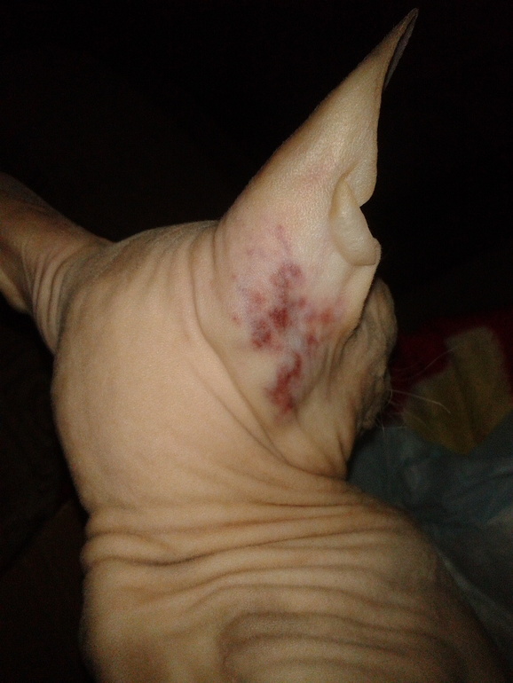 на фото не так видно наши точки. но он весь на крапинку синию...И 3 гематомки. на ухе, спине и ноге. Пока новых кровоизлияний не было слава Богу. вот на ушке как это выглядит... ужас((