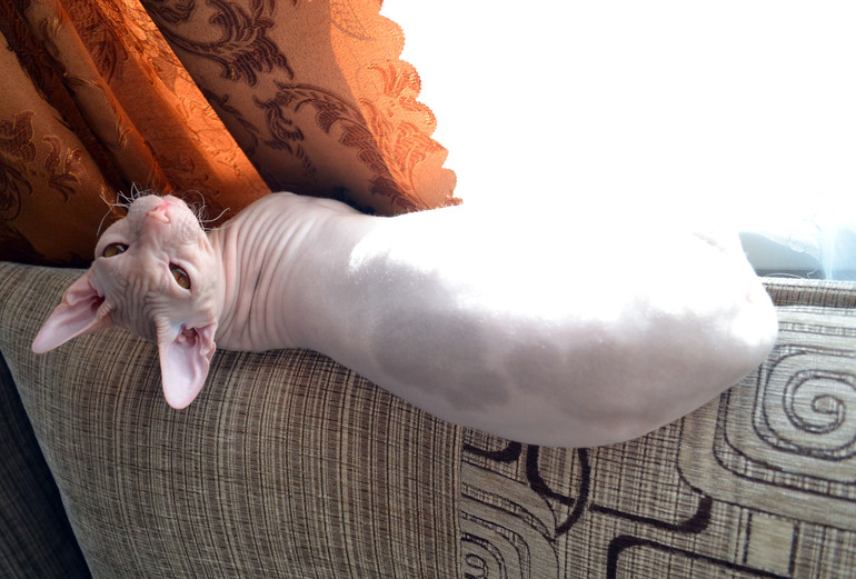 Еще конечно слабенький в плане массы, мерзнет. так и норовит обнять батарею, или забиться под одеялку, прилечь на солнышко... Из за чего очень не удобно ездить с ним в клинику... был бы комбез теплый на него или сумка-переноска, было бы лучше.но купить конечно пока не можем..поэтому приходится возить укутав в плед, из которого он постоянно хочет вылезти и смотреть куда его несут. )))